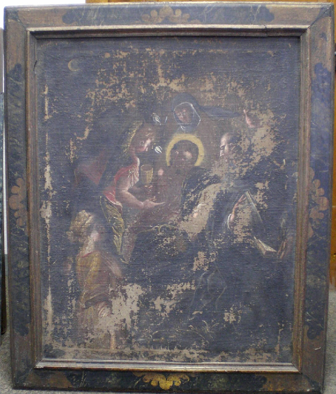 Dipinto a olio su tela, di forma rettangolare, in cornice di legno modanata e dipinta.