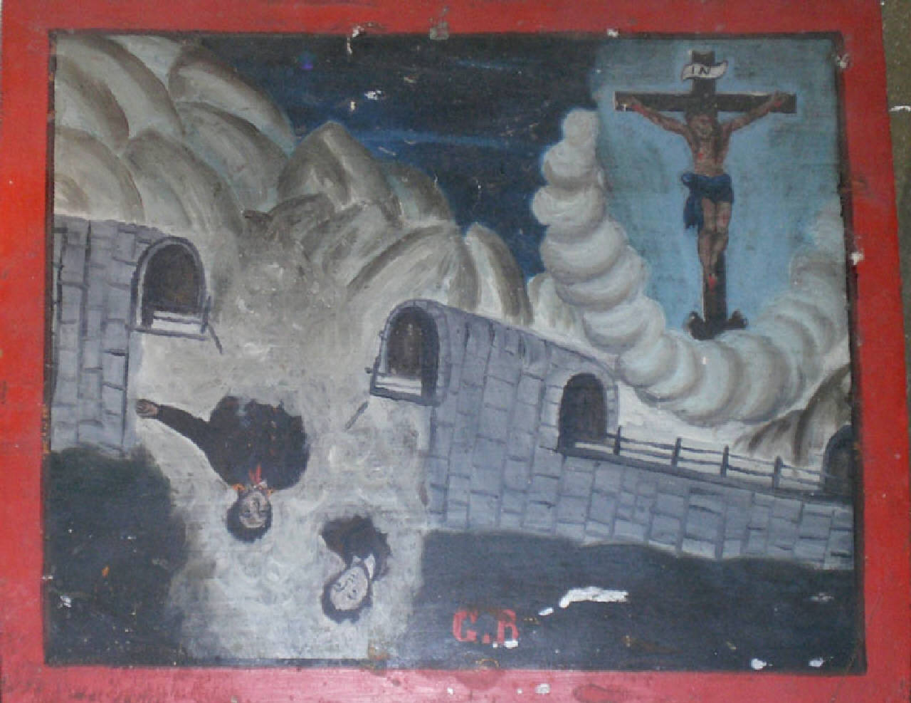 Tavoletta rettangolare di legno dipinta; finta cornice rossa dipinta.\nEx voto raffigurante sulla destra, in alto, circondato da nuvolette, il Crocefisso. La tavoletta raffigura una slavina che travolge due persone. La slavina ha invaso un tratto di strada tra due gallerie di pietra. Si vede infatti un tratto di strada dello Stelvio (?) con il relativo muro e parapetto. Delle due persone travolte si vede solamente il busto; il resto del loro corpo è sepolto dalla neve. In rosso in basso al centro le due lettere: G.R.