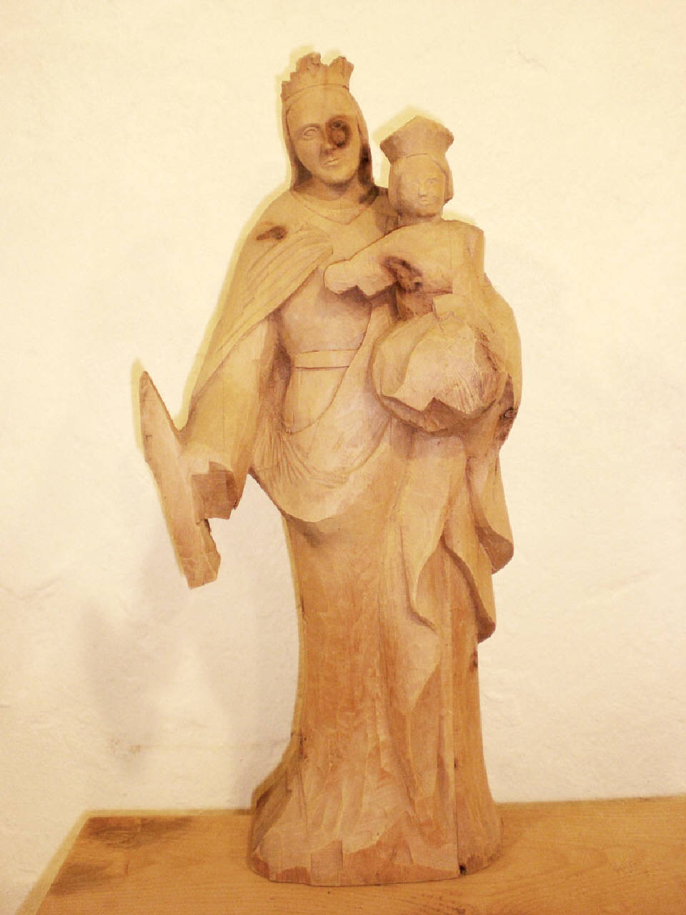 Scultura in legno intagliato rappresentante la Madonna stante con il Bambino in braccio. L'opera non è rifinita e in alcune parti, come la il corpo di Gesù e la mano destra della Madonna, è appena sbozzata. Mancano gessatura e coloritura. In corrispondenza dell'occhio sinistro della Madonna compare un grosso nodo del legno di colore più scuro.