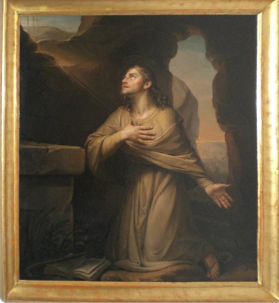 Dipinto a olio su tela, di forma rettangolare, in cornice di legno modanata e dorata. Riproduce San Ranieri in ginocchio con il braccio sinistro disteso e la mano destra sul petto, presso un altare di pietra, un libro aperto davanti alle ginocchia; lo sguardo è rivolto in alto a sinistra, verso le tre croci del Monte Calvario dipinte in lontananza; la scena è ambientata in uno spazio cavernoso, con apertura su paesaggio brullo alle spalle del santo.