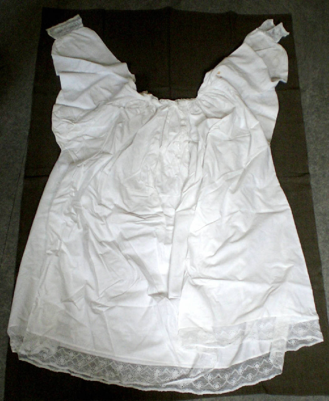 Camice ecclesiastico in cotone bianco. Il bordo inferiore, i polsini e il colletto sono decorati con pizzi.