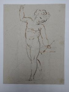 - NOTIZIE STORICO CRITICHE Il disegno rappresenta un amorino in atto di battere il dardo sull'incudine; il tema è molto vicino al repertorio eseguito da Appiani durante la sua collaborazione con la bottega dei Maggiolini ai quali fornì numerosi disegni. Anche lo stile, alquanto acerbo e rigido, oltre al tema, colloca il disegno intorno al 1780. Il disegno faceva parte della collezione privata di Giuseppe Vallardi che, intorno al 1820 ordinò in album ben 344 disegni di Appiani. L'album, di formato atlantico, pervenne all'Accademia di Brera nel 1875 per donazione di E. Cernuschi, allora residenta a Parigi, dove lo acquistò nel 1856-1860 (periodo in cui a Parigi si tennero aste di vendita di opere di provenienza Vallardi).