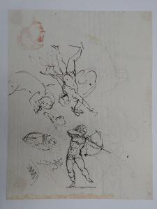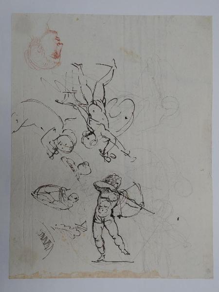 - NOTIZIE STORICO CRITICHE Il disegno rappresenta un amorino nell'atto di tirare con l'arco. Il tema è vicino al repertorio eseguito da Appiani durante la sua collaborazione con la bottega dei Maggiolini ai quali fornì molti disegni. Lo stile e la tecnica fanno propendere per una datazione intorno agli anni 1790; potrebbe infatti essere uno studio per "Amore in atto di ferire Giove addormentato" di cui esiste un disegno preparatorio conservato al Castello Sforzesco di Milano. Il disegno faceva parte della collezione privata di Giuseppe Vallardi che, intorno al 1820 ordinò in album ben 344 disegni di Appiani. L'album, di formato atlantico, pervenne all'Accademia di Brera nel 1875 per donazione di E. Cernuschi, allora residenta a Parigi, dove lo acquistò nel 1856-1860 (periodo in cui a Parigi si tennero aste di vendita di opere di provenienza Vallardi).