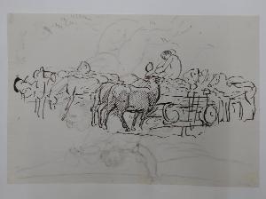 scena di genere con figure, cavalli, buoi e carro. scena di genere
