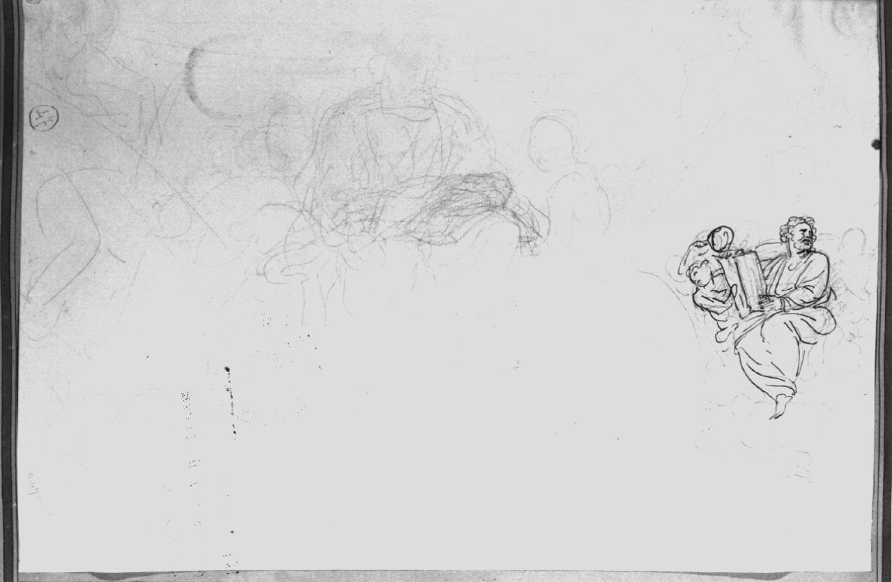 - NOTIZIE STORICO CRITICHE Il disegno presenta due studi per San Matteo e uno studio per San Giovanni, due dei quattro Evangelisti raffigurati nei pennacchi della cupola della chiesa di Santa Maria presso San Celso, affrescata da Appiani tra il 1792 e il 1795.\nAl verso due studi di teste maschili.\nIl disegno faceva parte della collezione privata di G. Vallardi che, intorno al 1820, ordinò in album ben 344 disegni di Appiani. L'album, di formato atlantico, pervenne all'Accademia di Brera nel 1875 per donazione di E. Cernuschi, allora residente a Parigi dove lo acquistò nel 1856-1860 (periodo in cui a Parigi si tennero aste di vendita di opere di provenienza Vallardi).