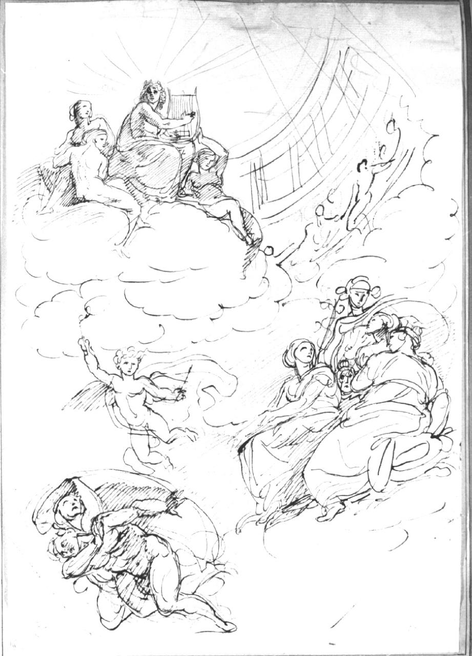 - NOTIZIE STORICO CRITICHE Molto probabilmente il disegno è un primo studio per l'affresco, poi non realizzato, rappresentante il "Trionfo di Giove sui giganti in Flegrea", di cui esiste un disegno con l'idea definitiva. Il progetto venne approvato il 23/01/1804 da una commissione formata da G. Traballes, V. Monti e G. Bossi e doveva decorare la medaglia centrale della Sala delle Cariatidi di Palazzo Reale per celebrare la Campagna di Russia, ma dato l'esito disastroso, non fu realizzata. Il disegno faceva parte della collezione privata di Giuseppe Vallardi che, intorno al 1820 ordinò in album ben 344 disegni di Appiani. L'album, di formato atlantico, pervenne all'Accademia di Brera nel 1875 per donazione di E. Cernuschi, allora residenta a Parigi, dove lo acquistò nel 1856-1860 (periodo in cui a Parigi si tennero aste di vendita di opere di provenienza Vallardi).\n\nVerificare.\nAl verso studio per figura femminile nuda seduta e studio per compartimento decorativo.