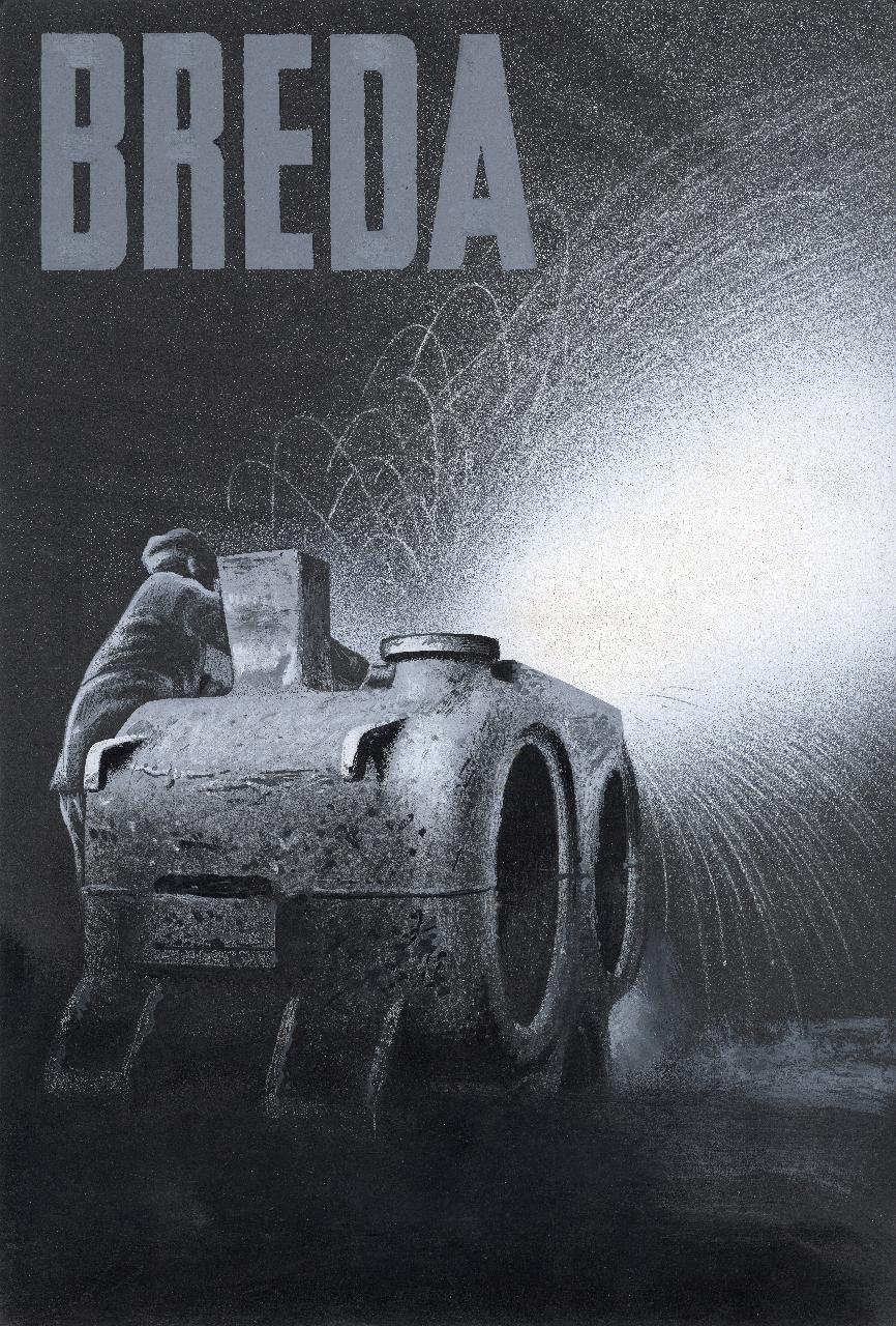 Bozzetto per campagna pubblicitaria della Società Breda. operaio al lavoro in fonderia accanto a un grande serbatoio, iscrizione