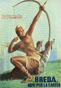 Pubblicità per il fucile automatico da caccia Breda. Diana cacciatrice inginocchiata tende l'arco con la freccia verso il cielo, animali, iscrizioni
