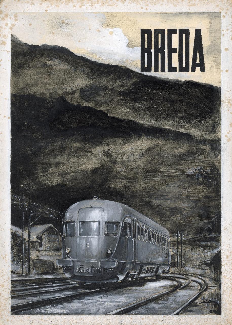 Bozzetto di automotrice a nafta per campagna pubblicitaria della Società Breda. automotrice in movimento, iscrizione