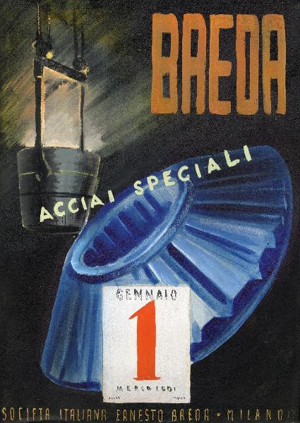 Bozzetto di acciai speciali per campagna pubblicitaria della Società Breda. forma di acciaio lavorato, vaso di versamento, iscrizioni