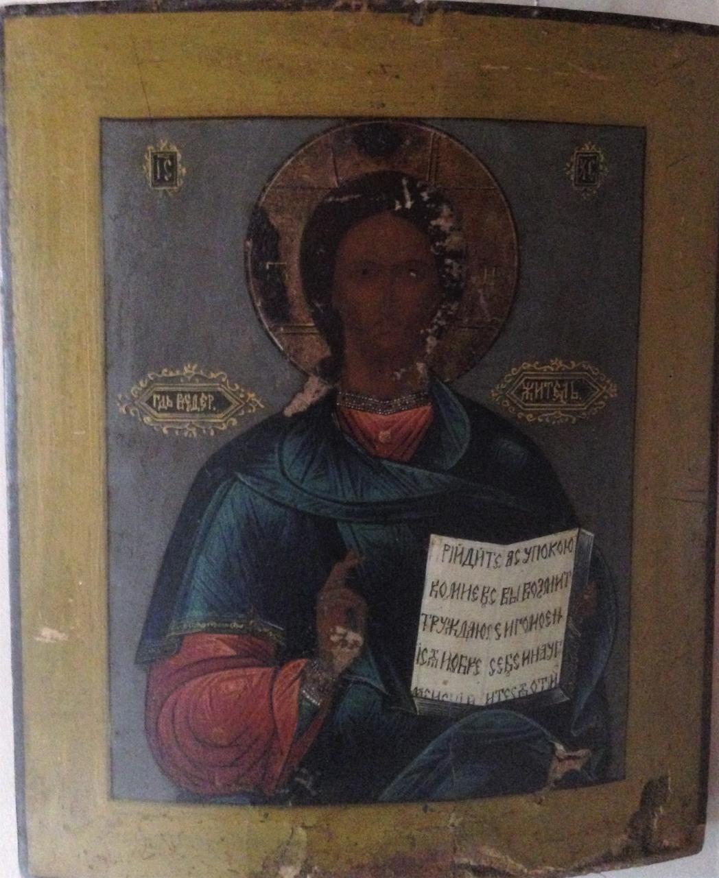 Icona russa raffigurante Cristo Pantocratore ritratto con mano destra benedicente alla maniera slava e nella sinistra, il Vangelo aperto, alla pagina: "Venite a me voi tutti..."