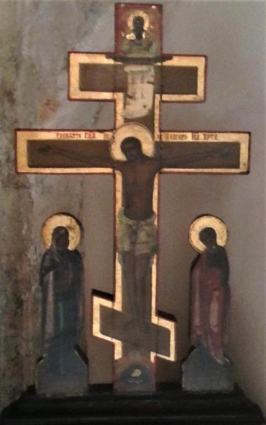 Icona russa raffigurante Cristo in Croce con a sinistra la Madre di Dio e a destra San Giovanni. La croce russa non ha precedenti storici: tre assi, due orizzontali e uno traverso, otto punte, in alto Dio "sabaoth" benedicente, in basso una grotta con teschio di Adamo che simboleggia l'umanità per la quale Gesù è morto in croce.