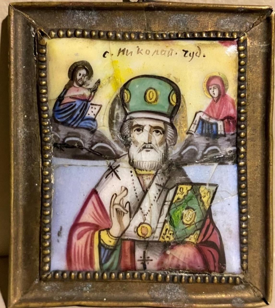 Icona russa raffigurante San Nicola, con la destra benedicente e nella sinistra il Vangelo chiuso. Ai due lati del volto del santo troviamo Gesù Cristo, a sinistra, e a destra la Madre di Dio che restituiscono a Nicola le insegne vescovili, sottratte quando fu imprigionato perché si era opposto all'eresia di Ario.