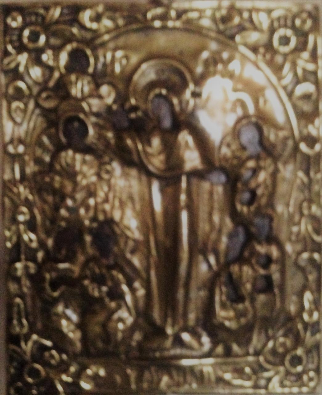 materiali vari/ Tempera all'uovo su tavola con riza in ottone cesellato e sbalzato