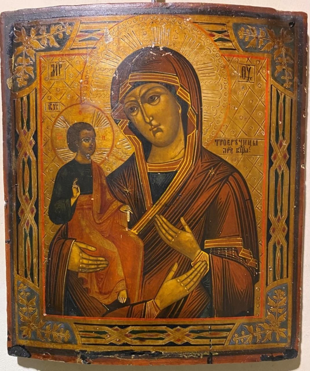 Icona russa raffigurante la Madre di Dio delle Tre Mani con in braccio il Figlio benedicente. Il canone iconografico di questa icona è strettamente legato alla figura del grande teologo S. Giovanni Damasceno (VIII sec.). L'icona mariana, il cui prototipo è l'Odighitria, presenta in basso, una mano che era posta sull'immagine venerata come ex-voto. Il fondo decorato e dorato presenta motivi a rilievo.