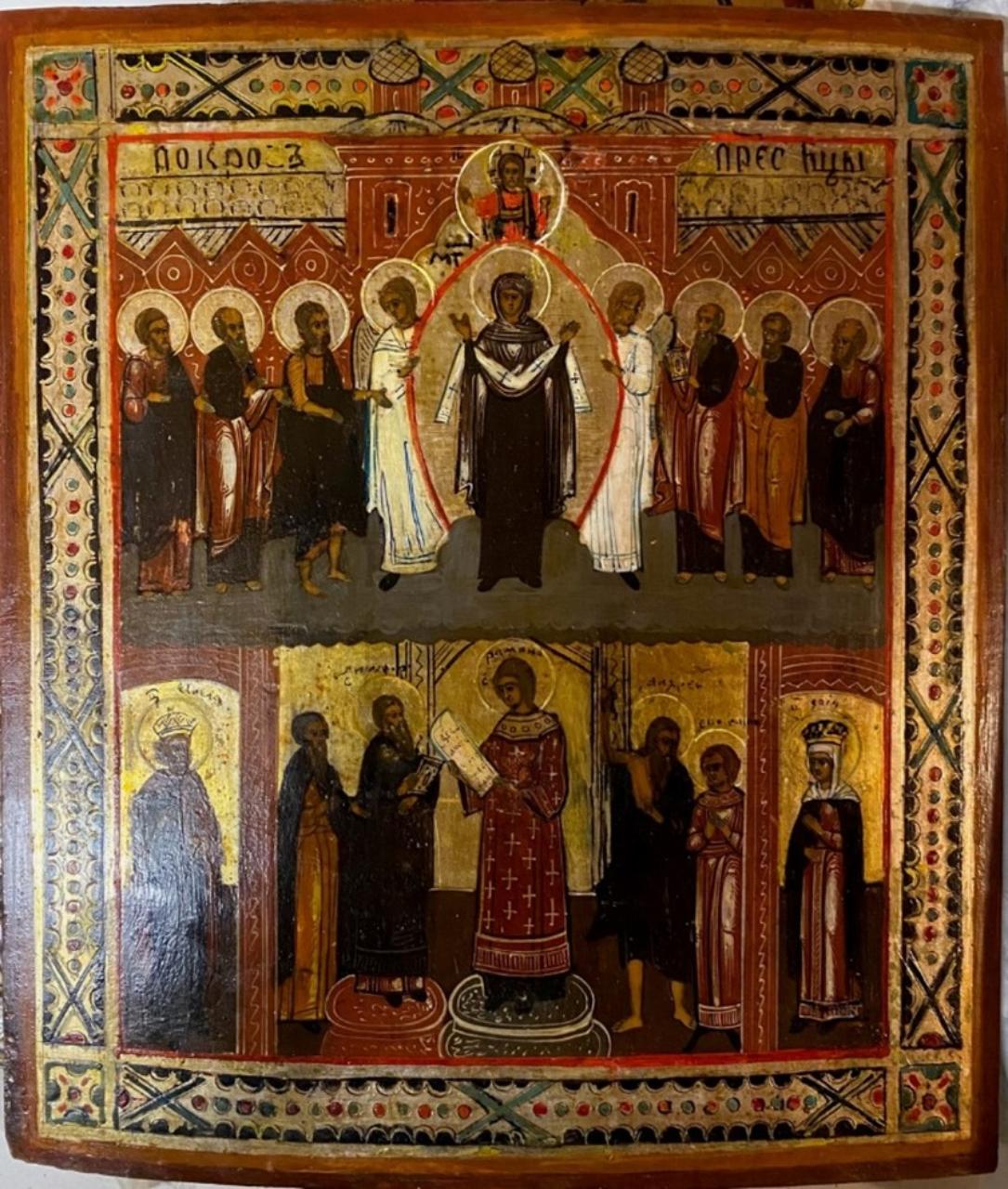 L'icona rappresenta la solenne festività che i cristiani bizantinoslavi celebrano il primo ottobre: la festa del "Pokrov" ovvero "La protezione del santo velo della Madre di Dio". La Madonna è rappresentata in atteggiamento orante, sopra di lei il Cristo Pantocratore, ai lati apostoli e profeti. In alto sono visibili le cupole della chiesa, in basso, davanti all'iconostasi, San Romano il Melode (VI sec.) con il rotolo che contiene il testo dell'Akàthistos di cui è compositore. Alla sua sinistra Andrea "folle in Cristo" illustra la sua visione al discepolo Epifanio.\nPer i cristiani bizantino-salvi la festa del Pokrov si riferisce ad una visione che il beato Andrea avrebbe avuto a Costantinopoli, nella Chiesa della Blacherne, nel X secolo. Egli aveva visto la Madre di Dio che stendeva sopra il popolo in preghiera il suo velo bianco, per proteggerlo dalle avversità. Questa icona è un'opera raffinata, destinata alla preghiera domestica di una famiglia abbiente della vecchia Russia. Il fondo decorato e dorato presenta motivi a rilievo.