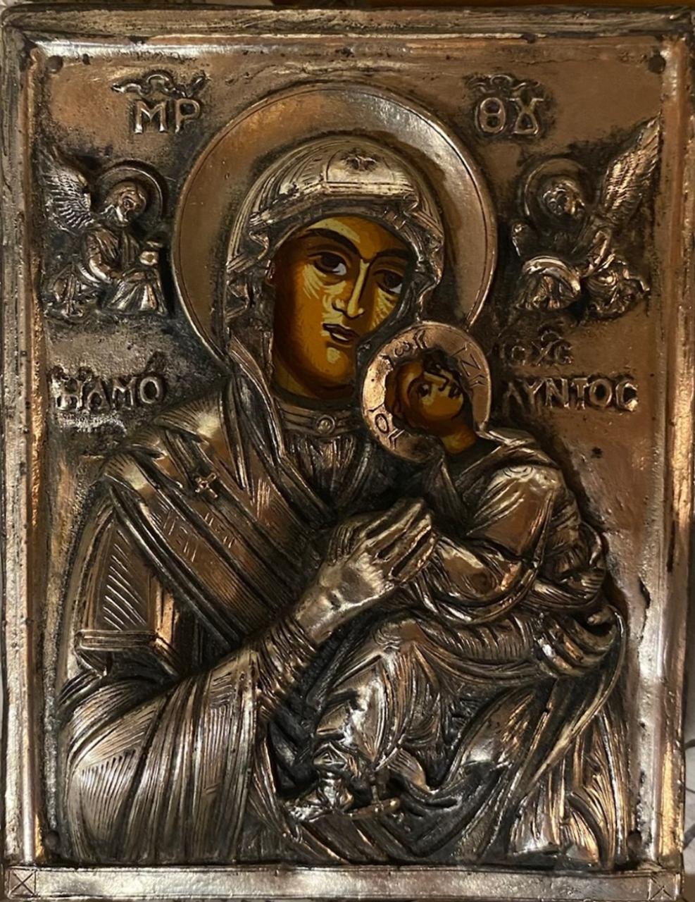 - NOTIZIE STORICO CRITICHE Fatta conoscere in Occidente come Madonna del Perpetuo Soccorso dai Redentoristi di sant’Alfonso, Maria de’ Liguori (o del Pollice), in Russia è nota col nome di Vergine dei dolori (Strastnaja) ed è una variante dell’Odighitria (Colei che indica la Via). La Madre che nell’icona abbraccia il Bambino impaurito, abbraccerà, poi, il Crocifisso deposto dalla croce; e su indicazione del Figlio, abbraccerà ognuno di noi, riconoscendo in ciascuno il suo Bambino, il suo Figlio crocifisso.\nUn primo esempio di questa tipologia fu dipinto da un iconografo cretese del XV secolo, Andrea Ritzos.\nEsplicito è il riferimento alla Passione di Cristo: ai lati del nimbo l’arcangelo Gabriele (con la lancia, la spugna e il vaso di aceto) e l’arcangelo Michele (con la croce) hanno le mani velate, in segno di adorazione per il Dio-fatto-uomo e per la Sua Passione, manifestazione della divina potenza redentrice.\n«Colui che un giorno aveva recato alla Purissima il lieto annuncio dicendole “Rallegrati”, ora le mostra i simboli della passione. Anche Cristo, rivestito di un corpo mortale, spaventato dalla morte che lo attende, contempla gli strumenti della Passione».\nIl simbolismo della passione-resurrezione è presente anche nel Bambino, che perde il sandaletto nel gesto improvviso causato dal timore della passione.\nLa lettera agli Ebrei ci ricorda che il sì di Gesù alla Croce, passa attraverso l’angoscia e la paura e solo dopo si risolve nell’abbandono fiducioso, così come ha sperimentato nel Getsemani (Mc 14,32-42), fino alla lotta (agonia) con il “sudore sanguigno” (Lc 22,39-46). \nLa Vergine ha lo sguardo rivolto ai fedeli, quasi a voler indicare loro che solo nel Figlio c’è la strada per vivere in modo salvifico ogni croce, ogni sofferenza.