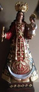 La Madonna, patrona dell’Ecuador, è presentata secondo i canoni della tradizione che si rifanno al fatto storico della fine del XVI secolo. La “Vergine del Cigno” è avvolta da un manto assai prezioso e regge il Figlio con la mano sinistra. Maria e il Bambino sono incoronati.\nLa statua è ornata in basso da una mezza luna; Gesù e la Madre hanno in mano lo scettro.\n\n\n