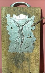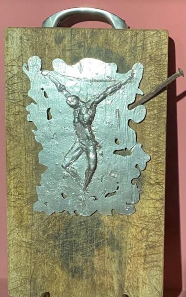 L’artista presenta una composizione su pannello con bassorilievo su pestacarne in legno, dove al centro è modellata l’immagine del Crocifisso. Il vistoso chiodo d’epoca caratterizza l’insieme sottolineando l’offerta sacrificale del Cristo per la salvezza di tutte le persone. \nComposizione assemblata con materiali di recupero.\n\n