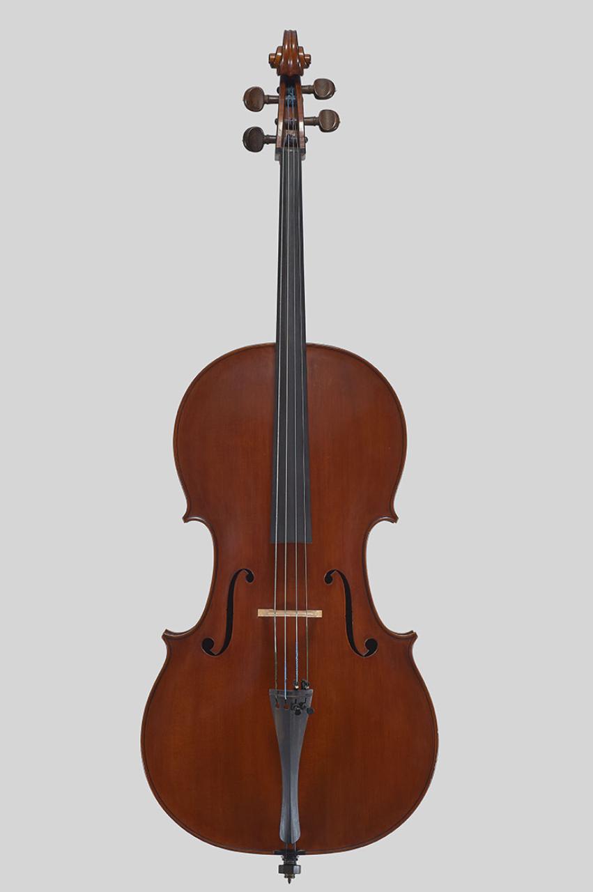 Strumento ispirato a modelli stradivariani, realizzato con cura e attenzione alla definizione dei dettagli. Il fondo e la tavola armonica sono costituiti da due pezzi giuntati al centro. La vicinanza del filetto al bordo dello strumento e il suo spessore -estremamente sottile- conferiscono alle due tavole un aspetto leggero ed elegante grazie ad un bordo ben arrotondato e privo di eccessive spigolature. Le punte sono ben lavorate e definite. Caratteristico il taglio dei fori di risonanza che presentano una paletta superiore molto larga e il giro superiore e inferiore tagliato molto stretto vicino alle rispettive palette. Le fasce presentano la giunzione alle punte tinta di nero. Caratteristica la lavorazione della testa che presenta una nocetta poco pronunciata, la cassetta dei piroli che si restringe in prossimità della chiocciola e lo smusso verniciato in nero. Il ponticello non è originale.