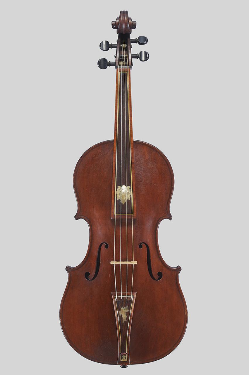 Strumento ispirato alla viola Medicea di Antonio Stradivari (Firenze, Gallerie dell'Accademia), come emerge dal modello, dalla montatura barocca, dai motivi decorativi della tastiera e della cordiera e dallo smusso verniciato di nero sulla testa. La vernice ha una tonalità particolarmente scura. Il fondo è costituito da due pezzi di taglio semiradiale.\n