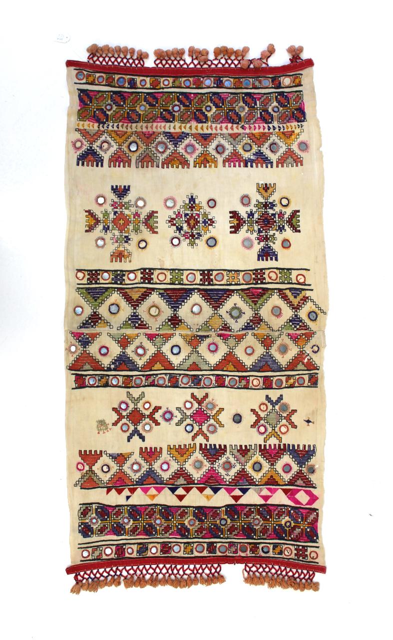 Il tessuto è ricamato con ricami a fili contati: soof e kharek entrambi sono del tipo punto piatto, ma si distinguono per i motivi decorativi. Il soof si caratterizza soprattutto per composizioni geometriche di triangoli, il kharek è così chiamato dal nome delle foglie della palma da dattero e fa parte del ricamo soof, si distingue per la lavorazione a barrette parallele di punto piatto lavorato densamente. Da notare inoltre il punto scrittura, il punto croce, il punto festone con cui sono applicati gli specchietti rotondi, le frange con perline e i pompoms di cotone. \nIl pezzo è costituito da due pezzi ricamati, probabilmente le estremità tagliate di una sciarpa o di una cintura, cucite insieme. \n(Studio di Paola Manfredi)\n