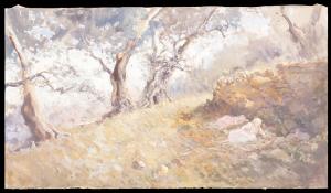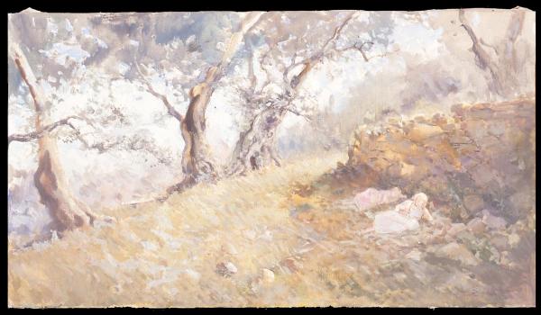 - NOTIZIE STORICO CRITICHE Il dipinto è da identificarsi probabilmente con il "Bosco di ulivi al tramonto", ugualmente datato, esposto alla Galleria Pesaro nel 1923 nell'ultima mostra personale tenuta dall'artista prima della sua scomparsa. Il dipinto risale al periodo ligure di Pompeo Mariani.