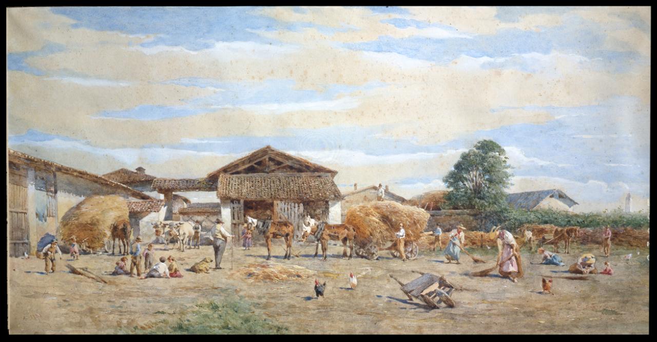 Sull'aia (Campagna lombarda). scena campestre con figure