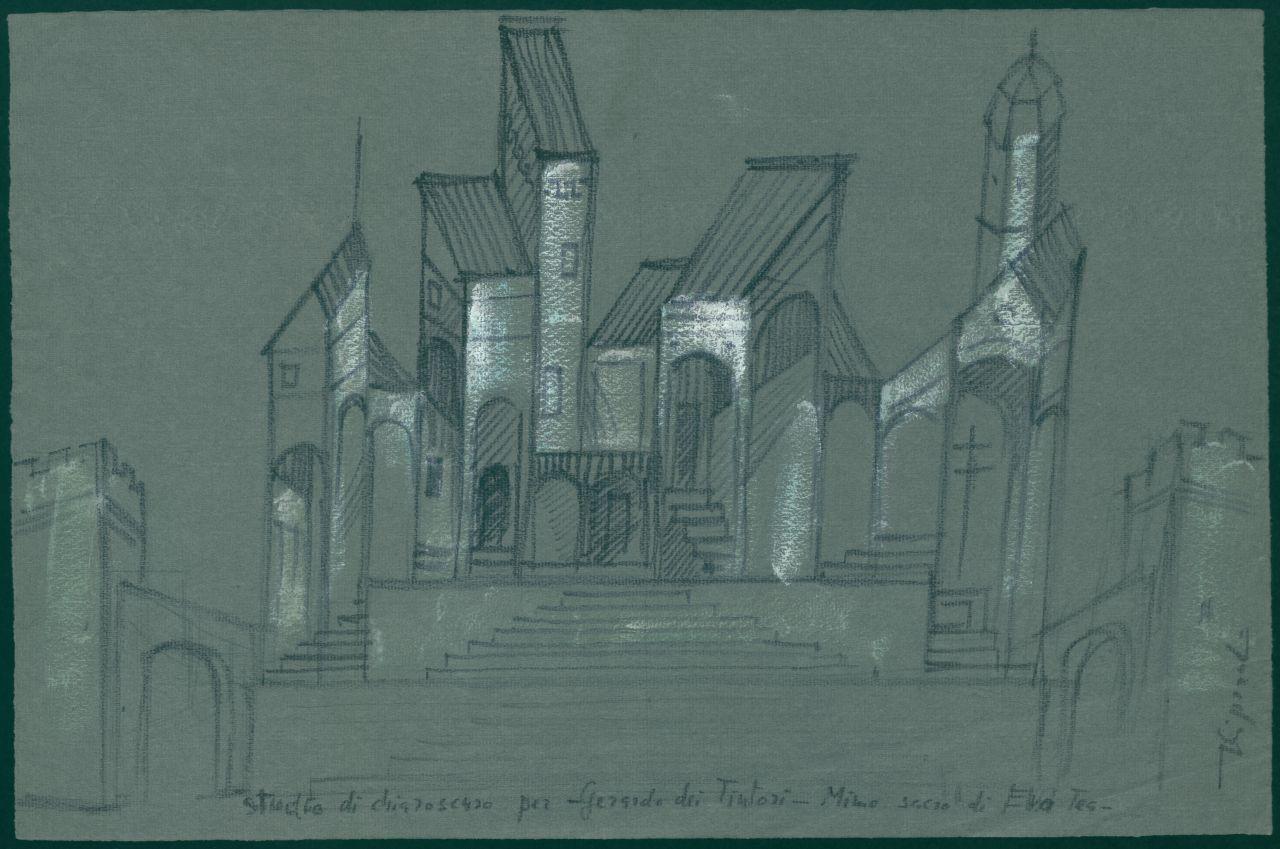 - NOTIZIE STORICO CRITICHE Dopo il diploma in pittura all'Accademia di Brera, Giancarlo Iliprandi si iscrive a scenografia nella classe di Pietro Reina. La scenografia permette a Iliprandi di entrare immediatamente nel mondo professionale, per esempio con la progettazione dei costumi e delle scenografie per "Il sacro mimo di Gerardo dei Tintori" scritto da Eva Tea, regia di Enrico D'Alessandro, messo in scena presso il parco di Villa Reale a Monza nel luglio 1950.