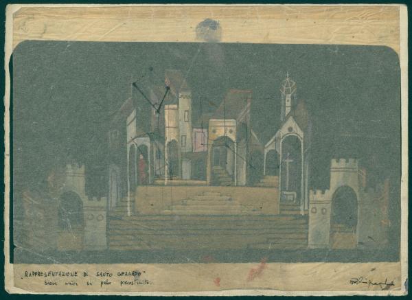 Studio per scenografia teatrale dello spettacolo "Il sacro mimo di Gerardo dei Tintori". architetture con scalinata