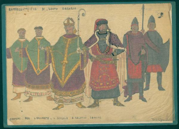 Figurini per costume di scena dello spettacolo "Il sacro mimo di Gerardo dei Tintori". costumi teatrali per arciprete, console e relativo seguito