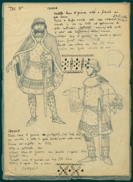 Disegno a pennarello realizzato su foglio di carta bianca. In sovrapposizione, incollato sul bordo superiore, foglio di carta da lucido con dettagli dei costumi e iscrizioni manoscritte con indicazioni sartoriali.