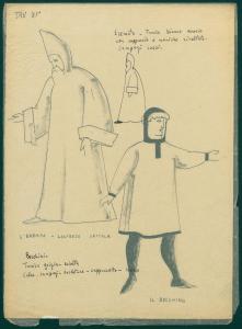 Figurini per costume di scena dello spettacolo "Il sacro mimo di Gerardo dei Tintori". costumi teatrali per l'eremita, Lanfredo Settala e il becchino