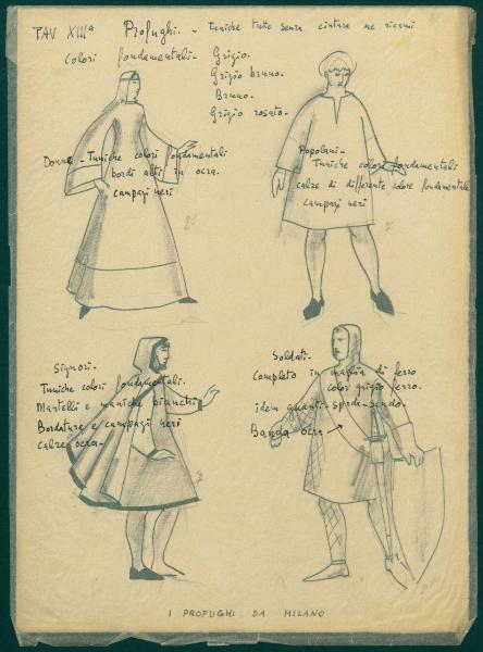 Figurini per costume di scena dello spettacolo "Il sacro mimo di Gerardo dei Tintori". costumi teatrali per i profughi da Milano