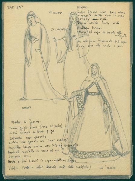 Figurini per costume di scena dello spettacolo "Il sacro mimo di Gerardo dei Tintori". costumi teatrali per Umana e per la madre