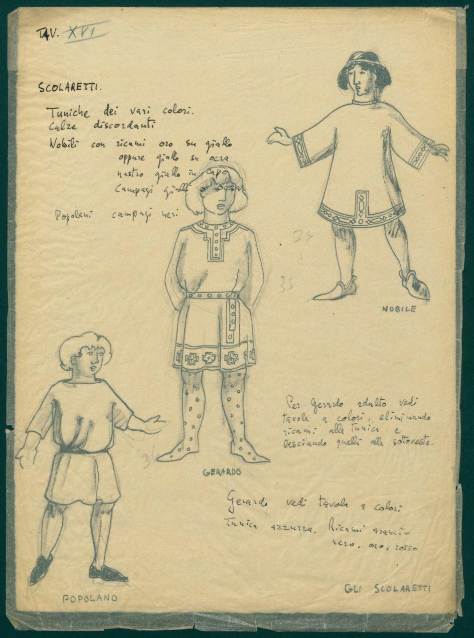 Figurini per costume di scena dello spettacolo "Il sacro mimo di Gerardo dei Tintori". costumi teatrali per nobile, Gerardo, popolano e gli scolaretti