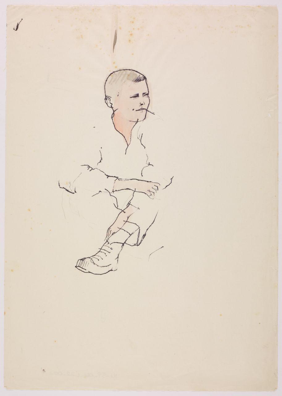 Bozzetto per l'illustrazione del pieghevole pubblicitario "Lettera allo studente" della società Olivetti. ragazzo seduto a terra