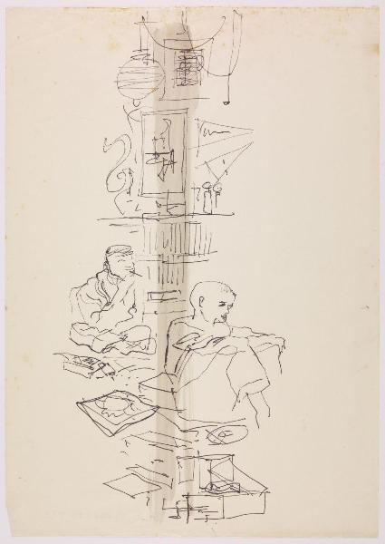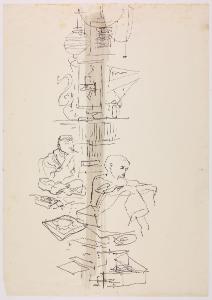 - NOTIZIE STORICO CRITICHE Disegno appartenete a una serie di schizzi eseguiti da Giancarlo Iliprandi per la realizzazione del pieghevole pubblicitario "Lettera allo studente" con il quale la società Olivetti si rivolge ai giovani italiani nel 1959 per promuovere e diffondere l'utilizzo della macchina da scrivere portatile "Lettera 22".