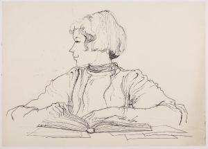 Bozzetto per l'illustrazione del pieghevole pubblicitario "Lettera allo studente" della società Olivetti. ragazza, a mezzo busto, sfoglia un libro