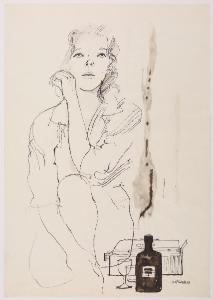 Bozzetto per l'illustrazione del pieghevole pubblicitario "Lettera allo studente" della società Olivetti. ragazza accovacciata con macchina da scrivere, bottiglia e bicchieri