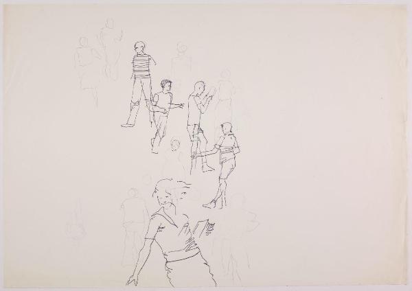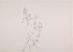 Bozzetto per l'illustrazione del pieghevole pubblicitario "Lettera allo studente" della società Olivetti. figure umane in movimento