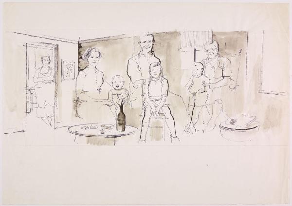 Bozzetto per la realizzazione di un pannello espositivo per la XXV Mostra Radio e Televisione. famiglia all'interno di un'abitazione