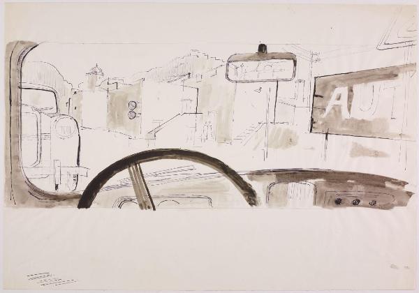Bozzetto per la realizzazione di un pannello espositivo per la XXV Mostra Radio e Televisione. cruscotto di automobile con volante e autoradio