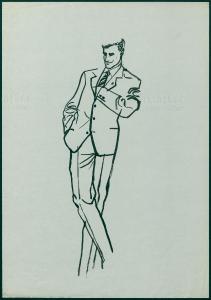 Disegno per annuncio pubblicitario per il reparto Uomo Moda maschile dei grandi magazzini la Rinascente. uomo in posa con abito elegante