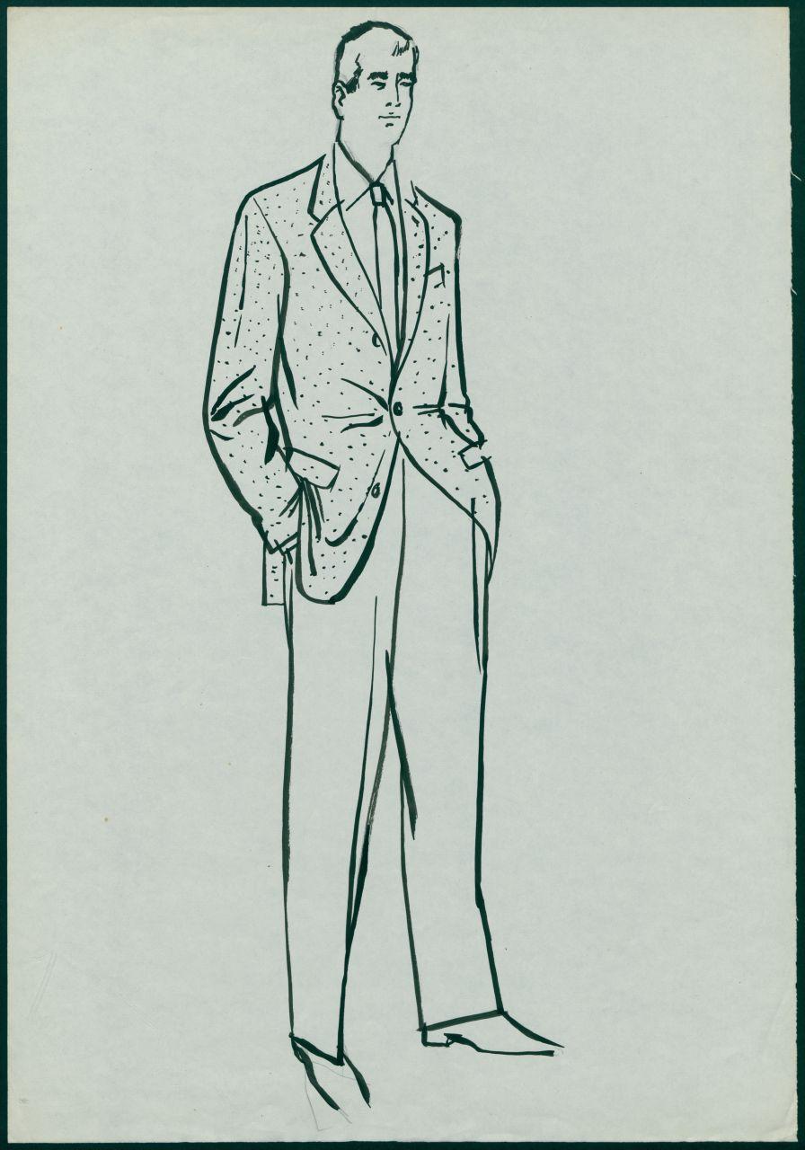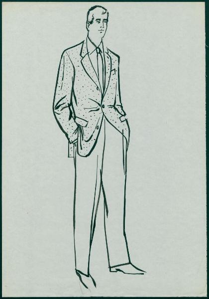 Disegno per annuncio pubblicitario per il reparto Uomo Moda maschile dei grandi magazzini la Rinascente. uomo in posa con abito elegante