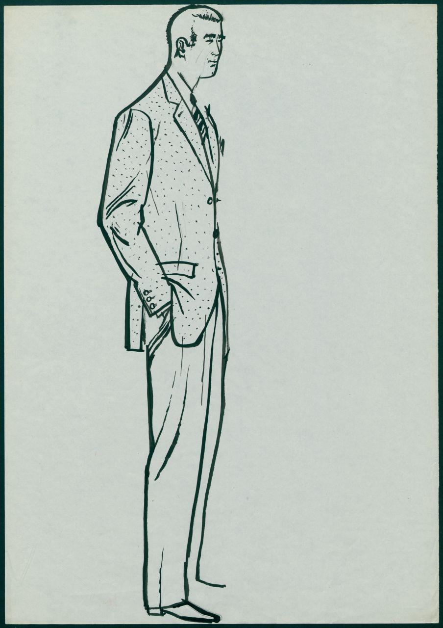 Disegno per annuncio pubblicitario per il reparto Uomo Moda maschile dei grandi magazzini la Rinascente. uomo in posa con abito elegante
