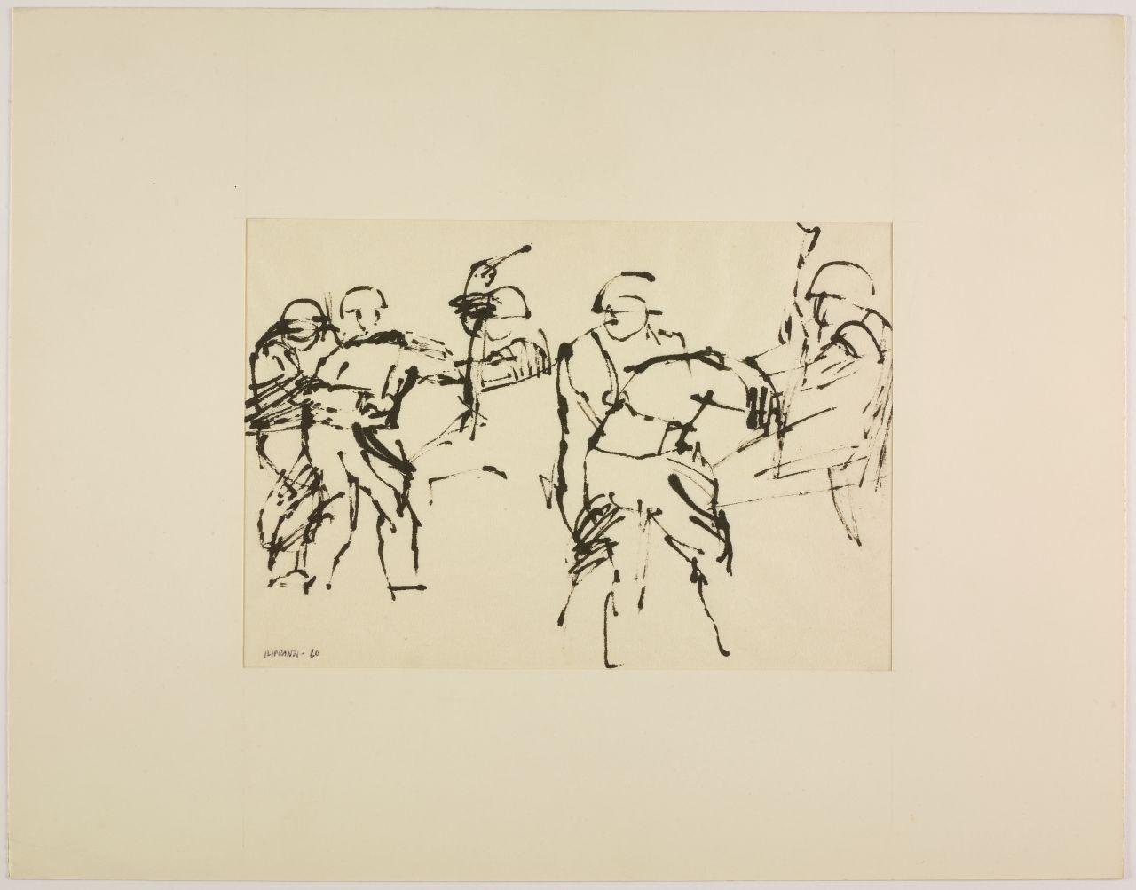 - NOTIZIE STORICO CRITICHE "Serie di immagini rapide, di strutture elastiche, in cui il peso diverso dei neri, e la composizione stabiliscono di volta in volta un movimentato equilibrio" [...] "Questi segni ci rivelano una trama di significati. File di elmetti, mani e bastoni alzati, braccia in atto di scagliare. Non simboli, ma qualcosa come la forma culminante di una situazione umana" [...] "In questi disegni qualcosa sta accadendo. Così non offrono un dato alla memoria, ma un oggetto all'emozione". Citazioni tratte dalla presentazione di Emilio Tadini alla mostra di disegni di Giancarlo Iliprandi alla Libreria Salto di Milano, 1961. L'ampio ciclo di disegni è stimolato dalla strage di Reggio Emilia del 7 luglio 1960, quando durante una manifestazione sindacale le violenze delle forze dell'ordine portarono alla morte di cinque operai. L'evento e l'ampio numero dei poliziotti impiegati, più di trecento, portarono Iliprandi a interrogarsi sulla violenza in una serie di disegni che sembrano seguire la radiocronaca dell'evento, con "movimenti di macchina" che si avvicinano e allontanano di continuo dalle scene del tumulto, focalizzandosi sulle masse, vuoi dei militari vuoi dei manifestanti, così come sui corpi a terra dei feriti e dei morti. Il disegno a china su carta di riso evidenzia l'urgenza espressiva e le possibilità drammatiche, evidenti soprattutto quando la scena è ridotta a poche chiazze d'inchiostro, oppure agli ultimi movimenti convulsi di un corpo disteso a terra. Scene di cronaca che evocano al contempo momenti universali e fuori dal tempo riferendosi più in generale alle lotte e alle violenze di tutti i tempi. L'ampio ciclo di disegni è realizzato per una mostra alla Libreria Salto di Milano. Da questa serie di opere Iliprandi ricava anche una più ampia riflessione sul rapporto tra grafica e disegno creando una sequenza d'immagini introdotta da un breve testo. Un materiale che sembrerebbe costituire una sezione speciale della stessa mostra: "sezione inutile per quanti sono esperti di codeste cose, militano in questo campo, ma utile forse per i profani, che sono sempre la maggioranza e che sanno così poco del nostro lavoro di ricerca". Lo stesso testo con una selezione d'immagini è poi pubblicato sulla rivista "Serigrafia" nel maggio-giugno 1963 con il titolo "Incontro fra la grafica e il disegno". Dopo un decennio di esperienze professionali dove la pittura e il disegno si intersecano con la grafica e la fotografia, Iliprandi crede di dover mettere a punto qualche considerazione, probabilmente stimolato anche nel vedere alla propria mostra una certa incapacità di leggere criticamente il disegno e constatare una sempre maggiore richiesta di specializzazione professionale.
