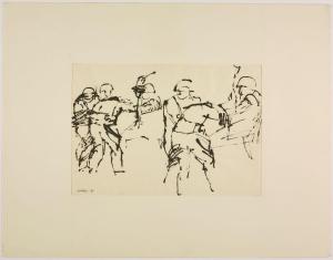 Disegno per mostra allestita alla Libreria Salto di Milano, 1961. militari colpiscono degli uomini