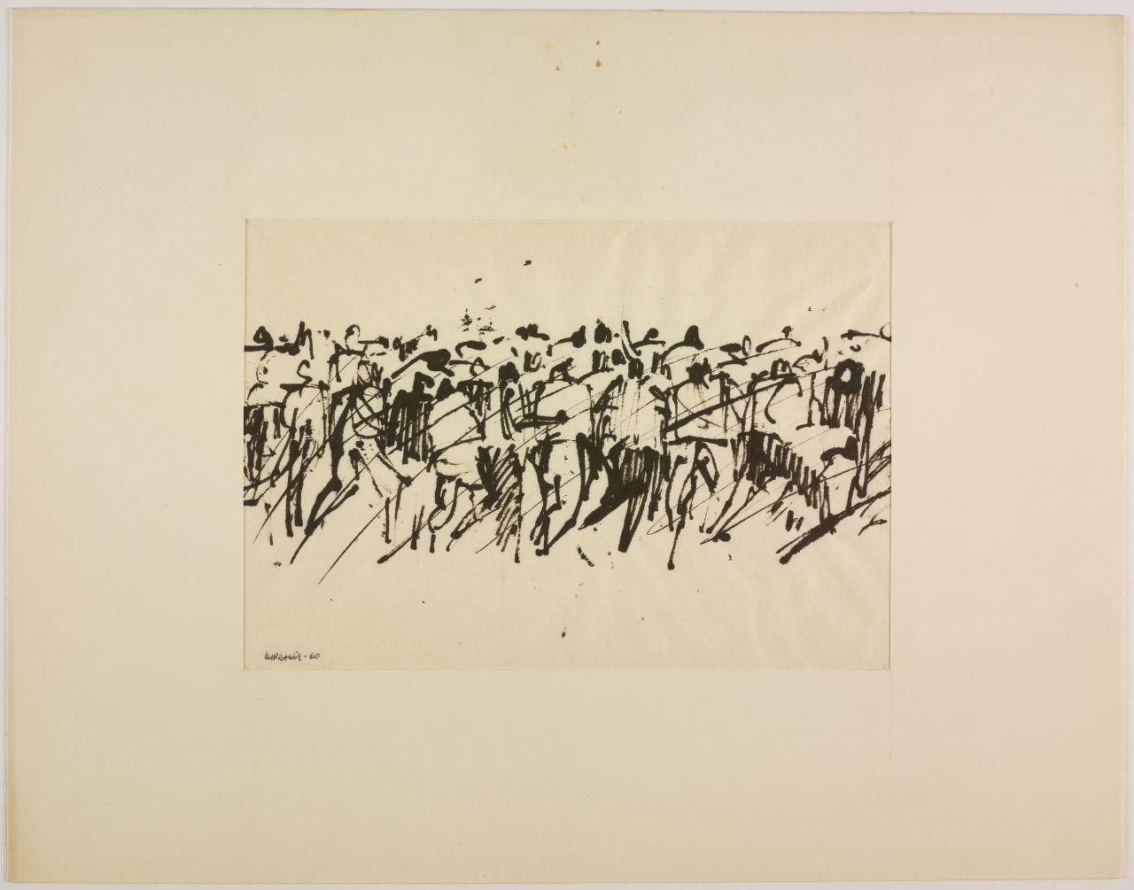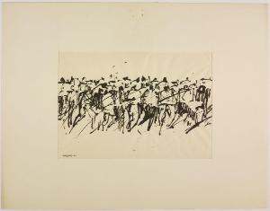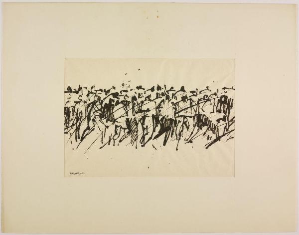 - NOTIZIE STORICO CRITICHE "Serie di immagini rapide, di strutture elastiche, in cui il peso diverso dei neri, e la composizione stabiliscono di volta in volta un movimentato equilibrio" [...] "Questi segni ci rivelano una trama di significati. File di elmetti, mani e bastoni alzati, braccia in atto di scagliare. Non simboli, ma qualcosa come la forma culminante di una situazione umana" [...] "In questi disegni qualcosa sta accadendo. Così non offrono un dato alla memoria, ma un oggetto all'emozione". Citazioni tratte dalla presentazione di Emilio Tadini alla mostra di disegni di Giancarlo Iliprandi alla Libreria Salto di Milano, 1961. L'ampio ciclo di disegni è stimolato dalla strage di Reggio Emilia del 7 luglio 1960, quando durante una manifestazione sindacale le violenze delle forze dell'ordine portarono alla morte di cinque operai. L'evento e l'ampio numero dei poliziotti impiegati, più di trecento, portarono Iliprandi a interrogarsi sulla violenza in una serie di disegni che sembrano seguire la radiocronaca dell'evento, con "movimenti di macchina" che si avvicinano e allontanano di continuo dalle scene del tumulto, focalizzandosi sulle masse, vuoi dei militari vuoi dei manifestanti, così come sui corpi a terra dei feriti e dei morti. Il disegno a china su carta di riso evidenzia l'urgenza espressiva e le possibilità drammatiche, evidenti soprattutto quando la scena è ridotta a poche chiazze d'inchiostro, oppure agli ultimi movimenti convulsi di un corpo disteso a terra. Scene di cronaca che evocano al contempo momenti universali e fuori dal tempo riferendosi più in generale alle lotte e alle violenze di tutti i tempi. L'ampio ciclo di disegni è realizzato per una mostra alla Libreria Salto di Milano. Da questa serie di opere Iliprandi ricava anche una più ampia riflessione sul rapporto tra grafica e disegno creando una sequenza d'immagini introdotta da un breve testo. Un materiale che sembrerebbe costituire una sezione speciale della stessa mostra: "sezione inutile per quanti sono esperti di codeste cose, militano in questo campo, ma utile forse per i profani, che sono sempre la maggioranza e che sanno così poco del nostro lavoro di ricerca". Lo stesso testo con una selezione d'immagini è poi pubblicato sulla rivista "Serigrafia" nel maggio-giugno 1963 con il titolo "Incontro fra la grafica e il disegno". Dopo un decennio di esperienze professionali dove la pittura e il disegno si intersecano con la grafica e la fotografia, Iliprandi crede di dover mettere a punto qualche considerazione, probabilmente stimolato anche nel vedere alla propria mostra una certa incapacità di leggere criticamente il disegno e constatare una sempre maggiore richiesta di specializzazione professionale.