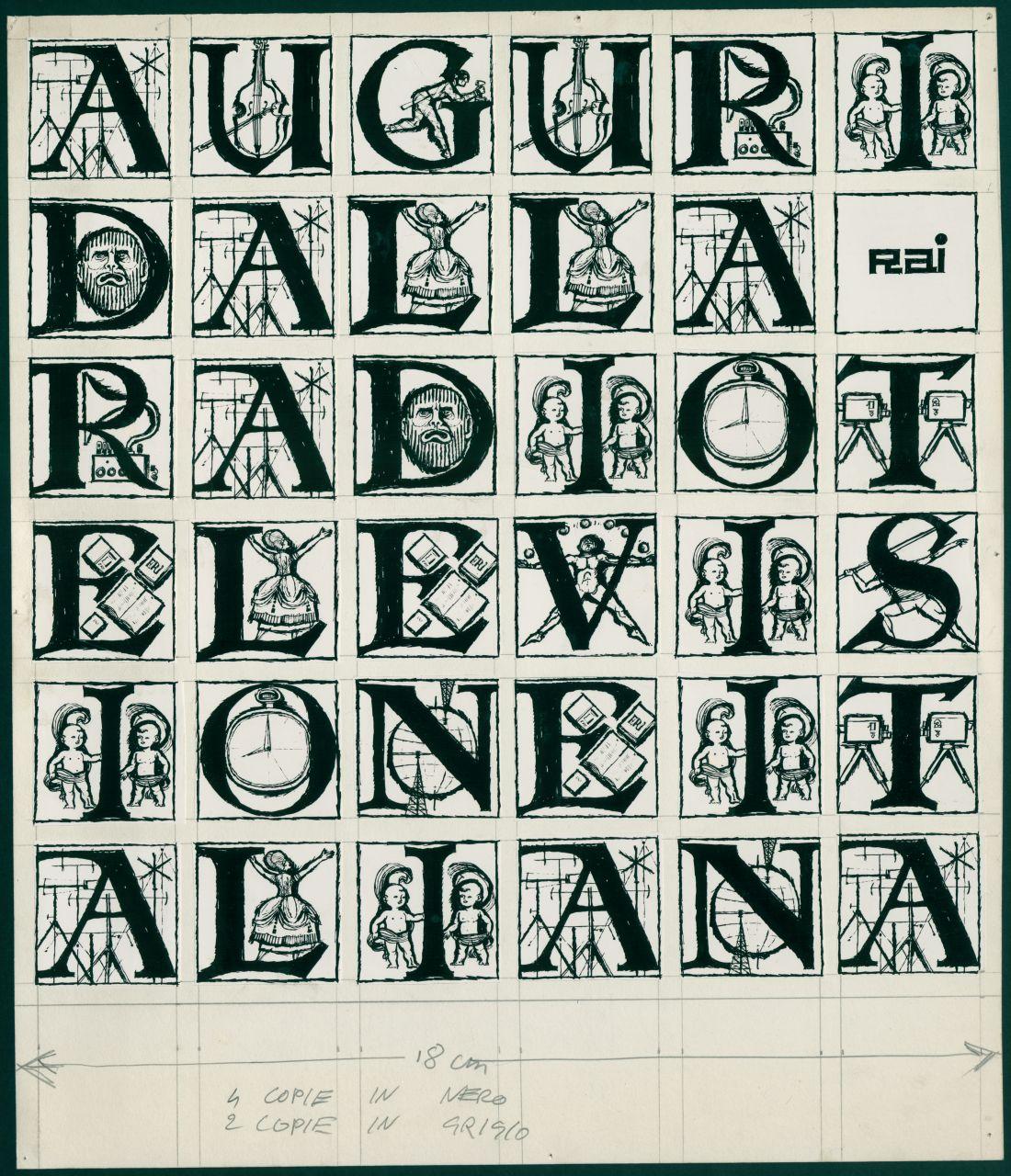 Esecutivo per biglietto di auguri della Rai - Radiotelevisione Italiana. lettere dell'alfabeto miniate